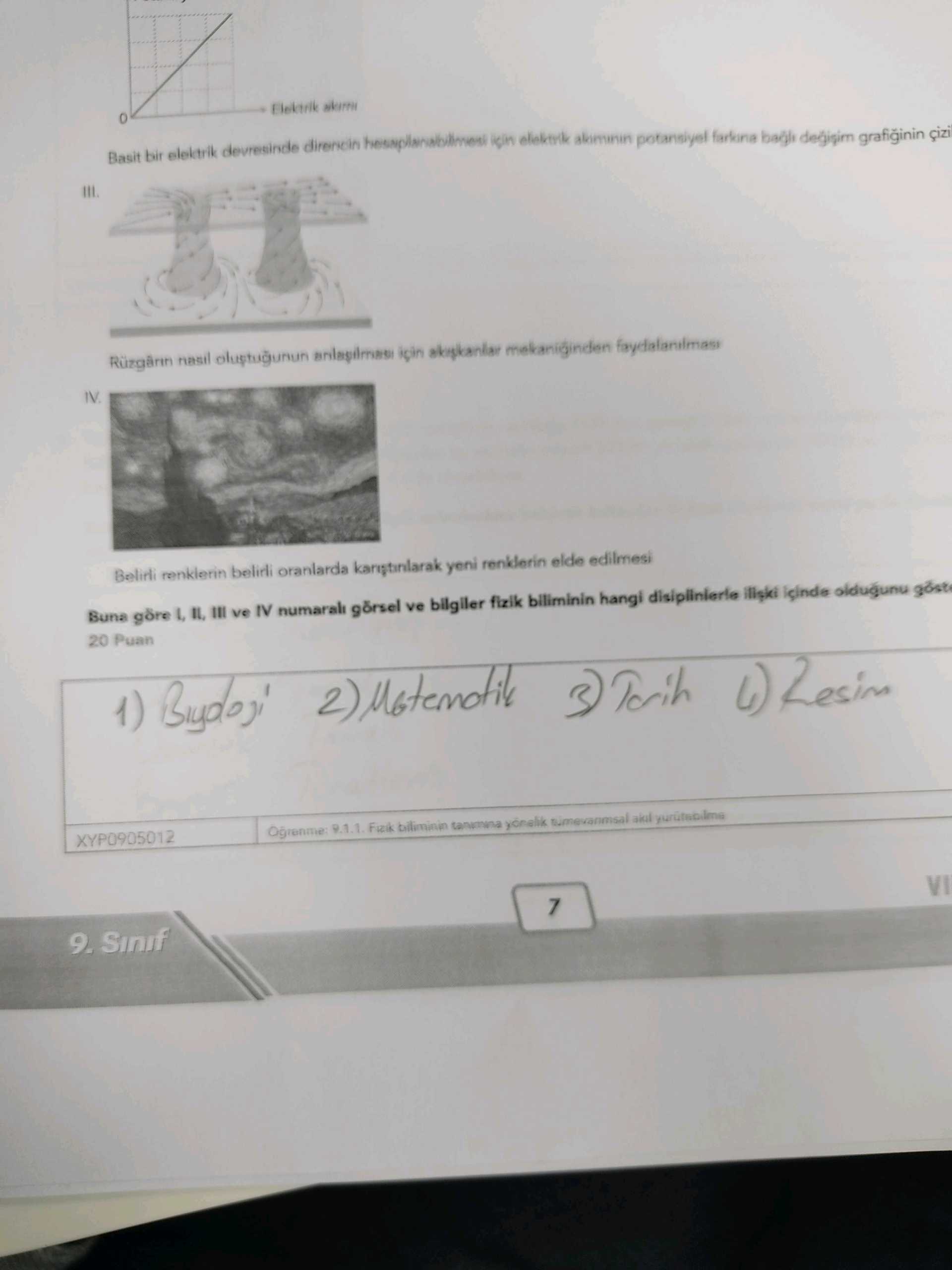 I → Biyoloji doğru (5), II → Matematik doğru (5), III için doğru cevap Coğrafya olmalıydı; Tarih yanlış (0), IV → Resim doğru (5). Toplam: 15/20. |