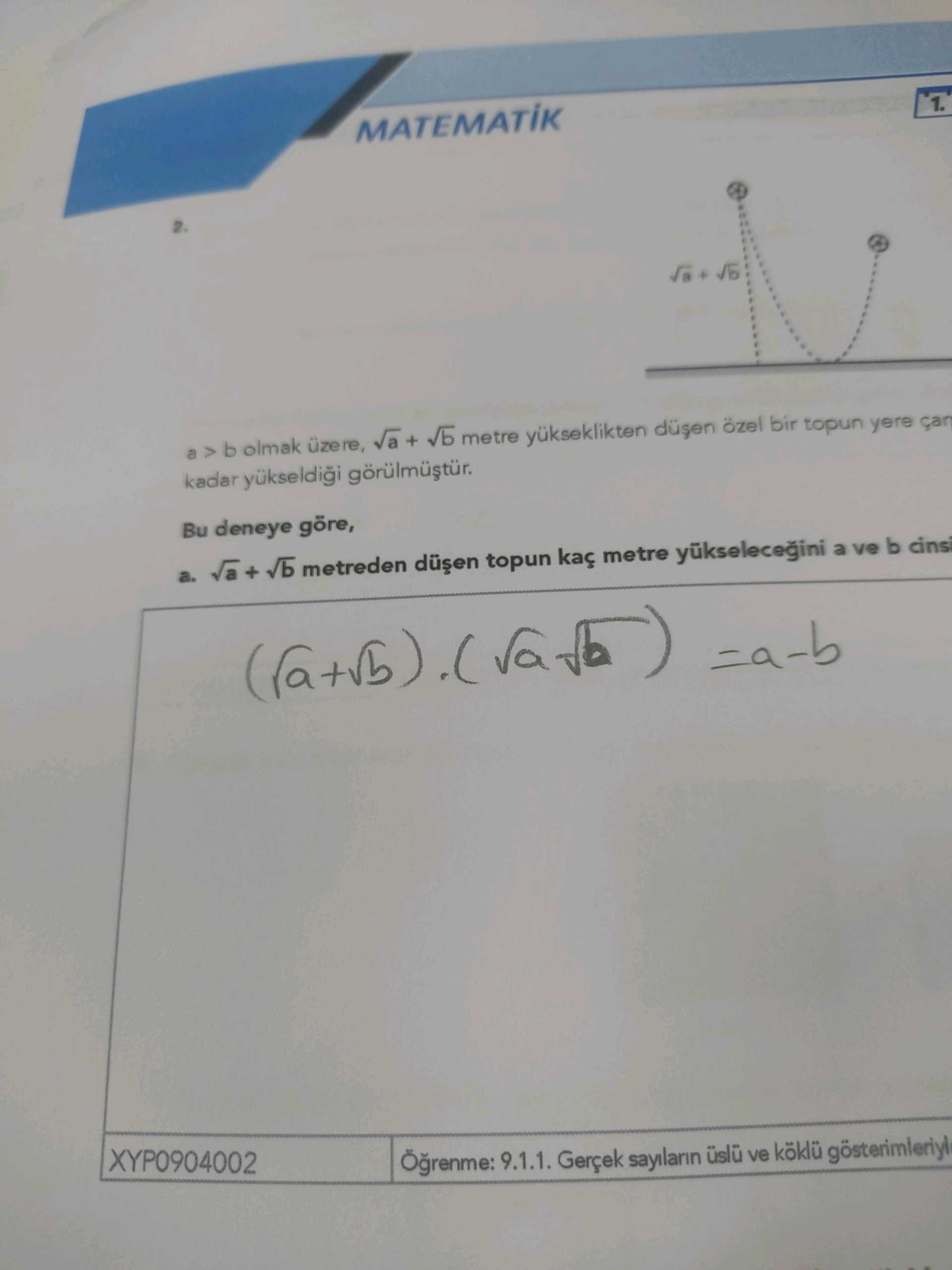 Cevap doğru; iki kare farkı özdeşliği ((x+y)(x−y)=x^2−y^2)) x=√a ve y=√b için uygulanınca (√a+√b)(√a−√b)=a−b elde edilir. Adımlar ayrıntılandırılmamış olsa da sonuç doğru olduğu için tam puan verilir. |